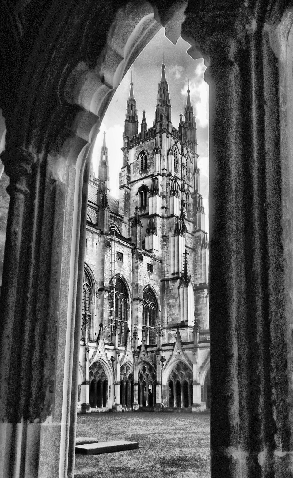 An external shot of Canterbury cathedral, taken from the cloisters through one of the archways. Taken with my samsung galaxy camera and edited on iPhone5